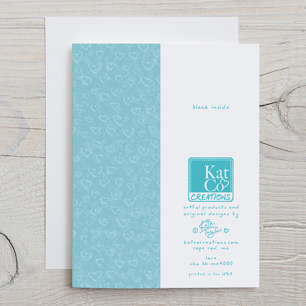 Original art created by Kathi Taylor. This whimsical and sweet "Love" mermaid greeting card says it all. Enjoy the added heart pattern on the back of the card. Blank inside so you can add your own personal note.