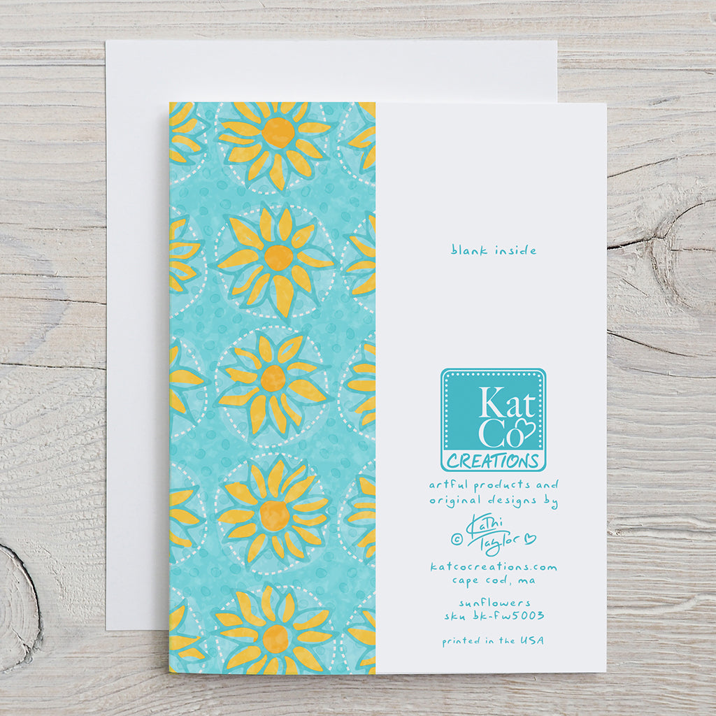 Bright and cheery "Sunflowers" by Kathi Taylor. A greeting card to brighten anyone's day. Kathi added a sweet mini sunflower to the front and a beautiful sunflower pattern on the back of the card. Blank inside so you can add your own personal note.
